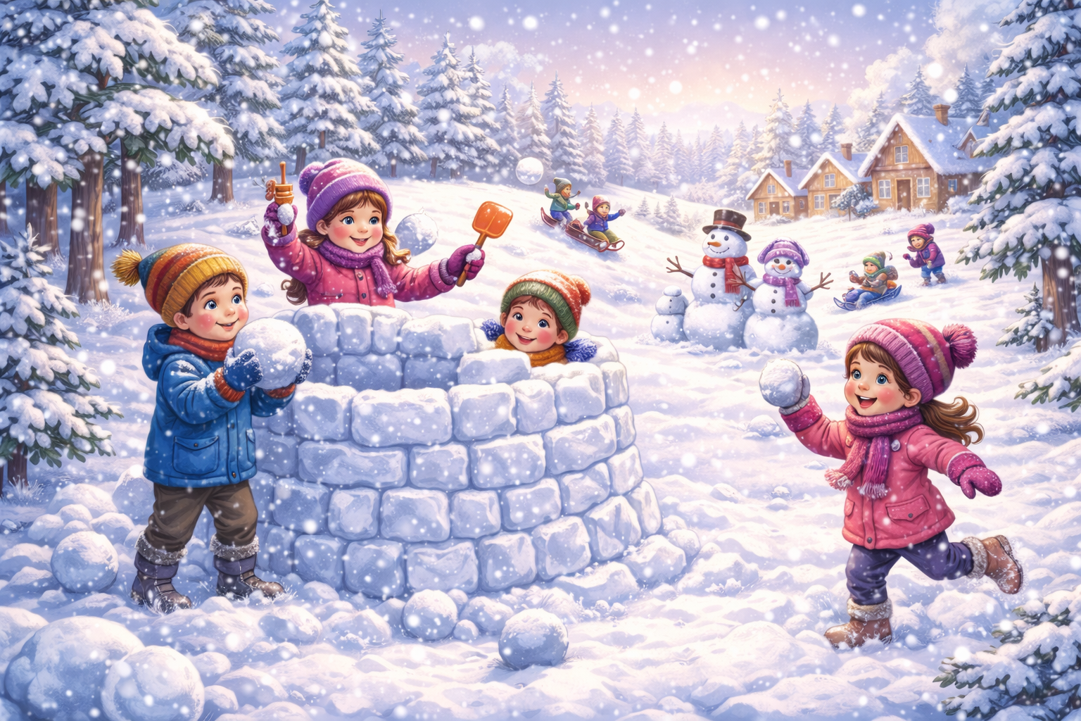 Outside, boots crunched and scarves flapped as the neighborhood kids burst into the snowy wonderland. Snowballs flew through the air (some missing by a mile), and soon the biggest snow fort ever imagined was under construction. Someone rolled a snowball so big it took four kids to push it.